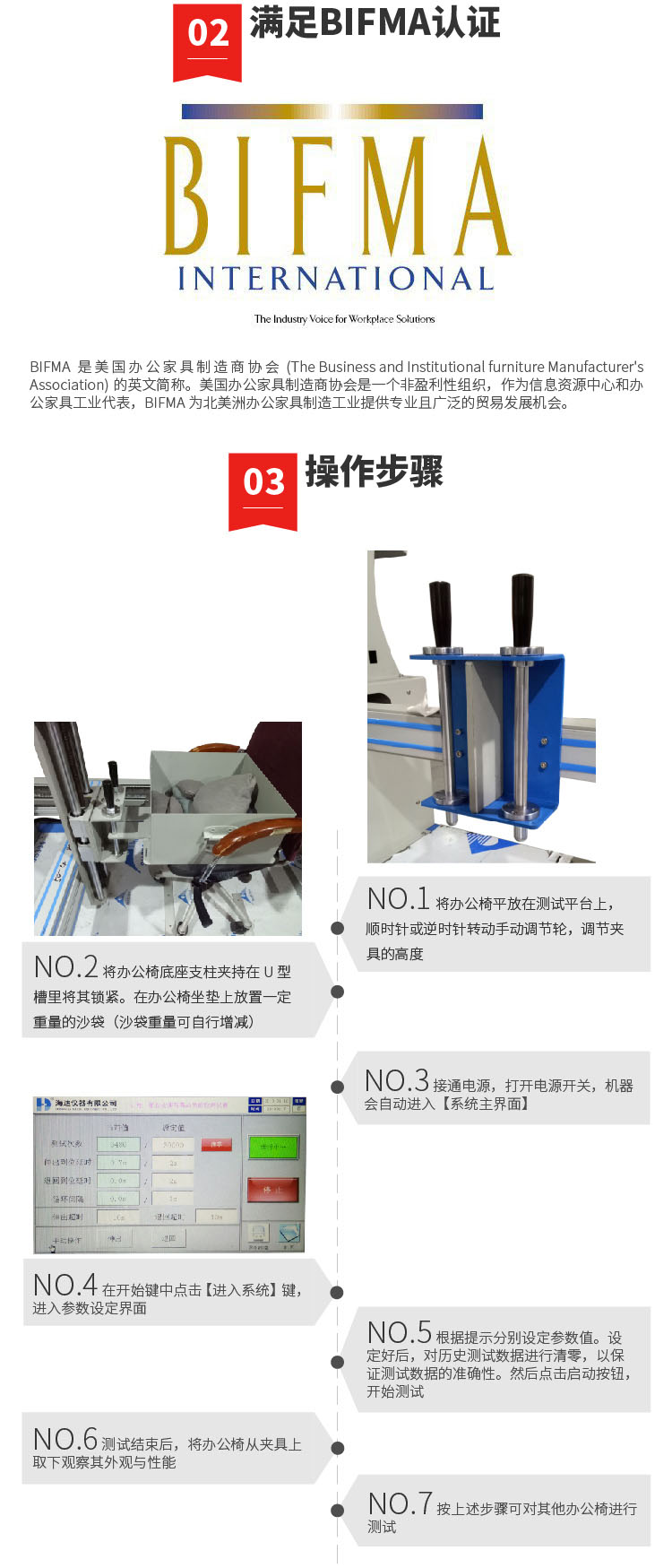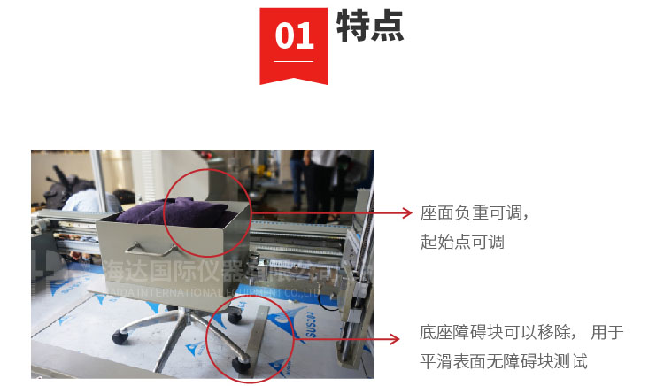 本機(jī)適用于所有帶腳輪或椅輪的辦公椅,評核腳輪及椅框?qū)τ诘质芤巫忧昂笠苿铀鸬钠趬毫澳p能力。 設(shè)計標(biāo)準(zhǔn):Bifma5.1 第17節(jié);Bifma 5.5 第8 節(jié);Bifma 5.9 第11節(jié) | ||