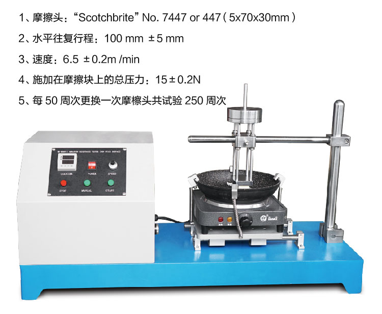 1、 摩擦頭:“Scotchbrite” No. 7447 or 447 (5x 70 x30mm) 2、 水平往復(fù)行程:100 mm ±5 mm 3、 速度:6.5 ±0.2m /min 4、 施加在摩擦塊上的總壓力:15±0.2N 5、 沒50周次更換一次摩檫頭共試驗(yàn)250周次 | ||