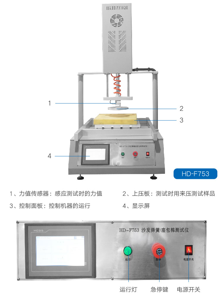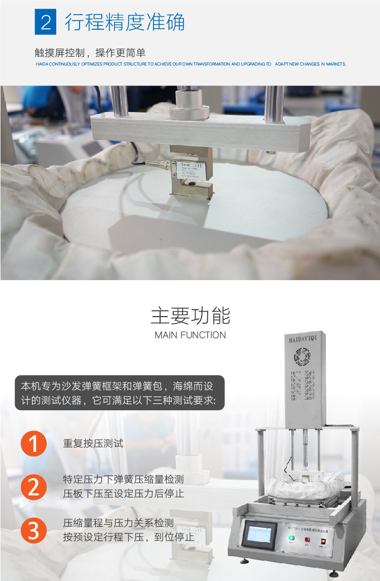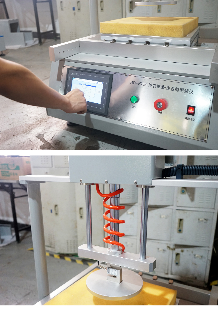 沙發(fā)彈簧測試儀用于測試沙發(fā)及家具坐墊的彈簧框架及彈簧包和彈簧坐墊的耐久性和承受力??砂搭A(yù)設(shè)定之壓力條件進(jìn)行重復(fù)按壓測試,周期可預(yù)設(shè)定,到數(shù)自動(dòng)停止。 | ||