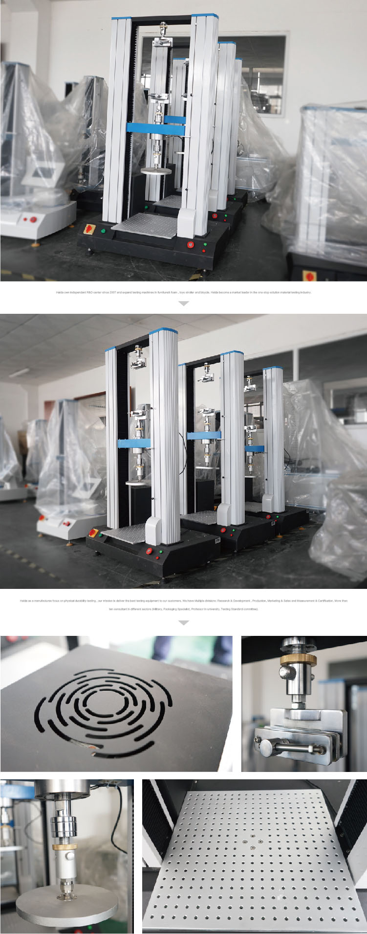 本產(chǎn)品廣泛應(yīng)用于測試各類五金、金屬、橡塑料、鞋業(yè)、皮革、服裝、紡織、絕緣體、電線電纜、端子等材料的拉伸、撕裂、剝離、抗壓、彎曲抗剪力、三點抗折、延伸率,以及對海綿、泡沫等多孔彈性材料的壓縮凹入硬度、壓陷比等各項物性性能的測試。也用于測定海綿、泡沫等多孔彈性材料的壓縮凹入硬度和計算壓陷比 設(shè)計標準:GB/10807-2006, ITTC 1.1 硬度測試,ITCC 1.2 壓陷比 ISO2439, ASTM D3574 HG/T 5836-2021 乳膠墊 本標準規(guī)定了乳膠墊的要求、試驗方法、檢驗規(guī)則和包裝、標志、運輸與貯存。本標準適用于由天然膠乳、合成膠乳或由天然膠乳與合成膠乳并用的混合膠乳加入配合劑經(jīng)發(fā)泡、硫化等工藝制備的乳膠墊芯與墊套組成的乳膠墊 操作原理 壓陷硬度測試:將試樣置于上、下壓盤間,上壓盤以規(guī)定速度向下壓縮一定的尺寸,按標準要求的A法(B法、C法)進行測試,荷重元將感應(yīng)到的壓力反饋給電腦處理,通過電腦測試界面查看數(shù)據(jù)結(jié)果,從而測得海綿、泡沫等試樣等材料的壓陷硬度。 拉伸測試:沿試樣縱向主軸方向恒速拉伸,直到試樣斷裂或其應(yīng)力(負荷)或應(yīng)變(伸長)達到某一預(yù)定值,測量在這一過程中試驗承受的負荷及其伸長量。 | ||
