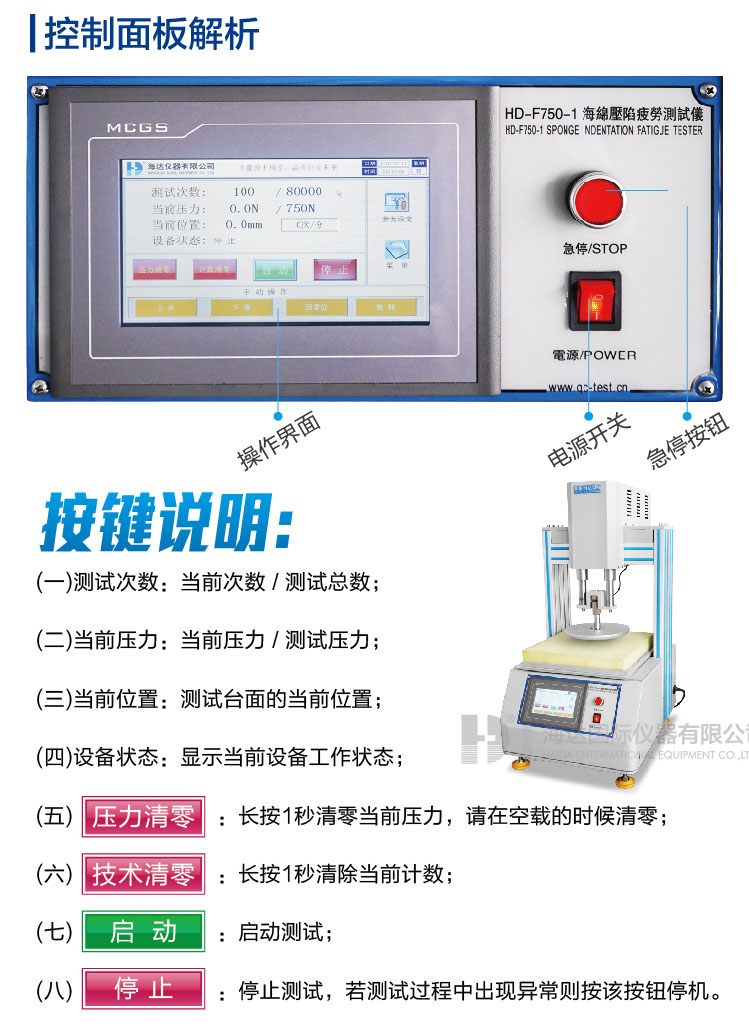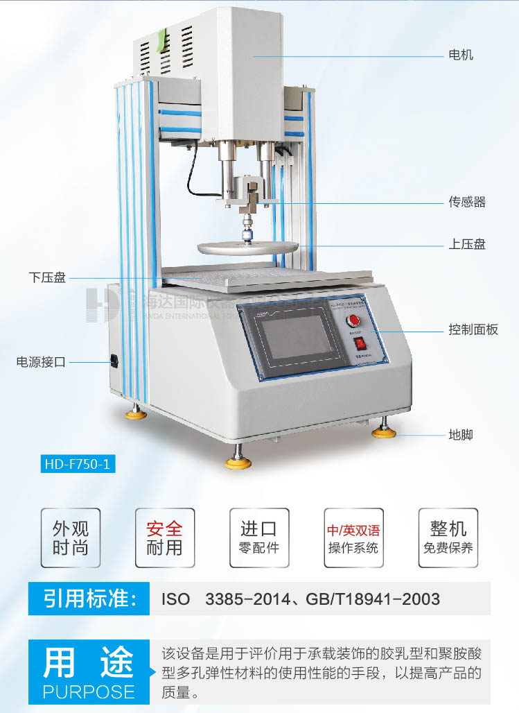 1) 試件:適用海綿尺度:0~400x400x100(L x W x H) 2) 控制方式:7寸觸摸屏+匯川PLC 3) 電氣連接:單相 AC220V/50HZ功率: 400W 4) 標(biāo)準(zhǔn)配件:上壓盤直徑(250 mm± 1 mm)一個、下壓盤:孔的直徑6mm, 間距20mm 5) 尺寸:整體600x500x1000(L x W x H) 6) 重量:500KG | ||