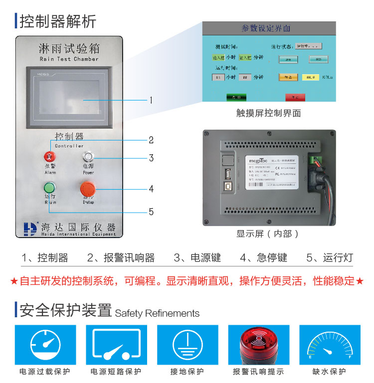 1、內(nèi)尺寸:1960*1960*1900mm (可按客戶要求定制)2、外尺寸:1960*1960*2250mm3、噴水環(huán)半徑:375或500mm4、水管直徑:φ16mm5、噴孔直徑:φ0.4mm6、孔徑間距:50mm7、擺管押幅: ±45°、±60°、±90°、±180°(理論數(shù)值)8、電壓:110V,60HZ9、試驗(yàn)臺轉(zhuǎn)速 :1r/min也可為無節(jié)調(diào)速(選配)10、控制器:進(jìn)口調(diào)頻式變頻器11、時間控制器:進(jìn)口可編程時間電腦集成控制器12、水壓控制:流量計13、觀察面:大面積可視化鋼化玻璃門14、供水系統(tǒng):儲水箱、增壓泵15、保護(hù)裝置:漏電、短路、電機(jī)過熱 | ||