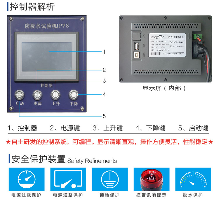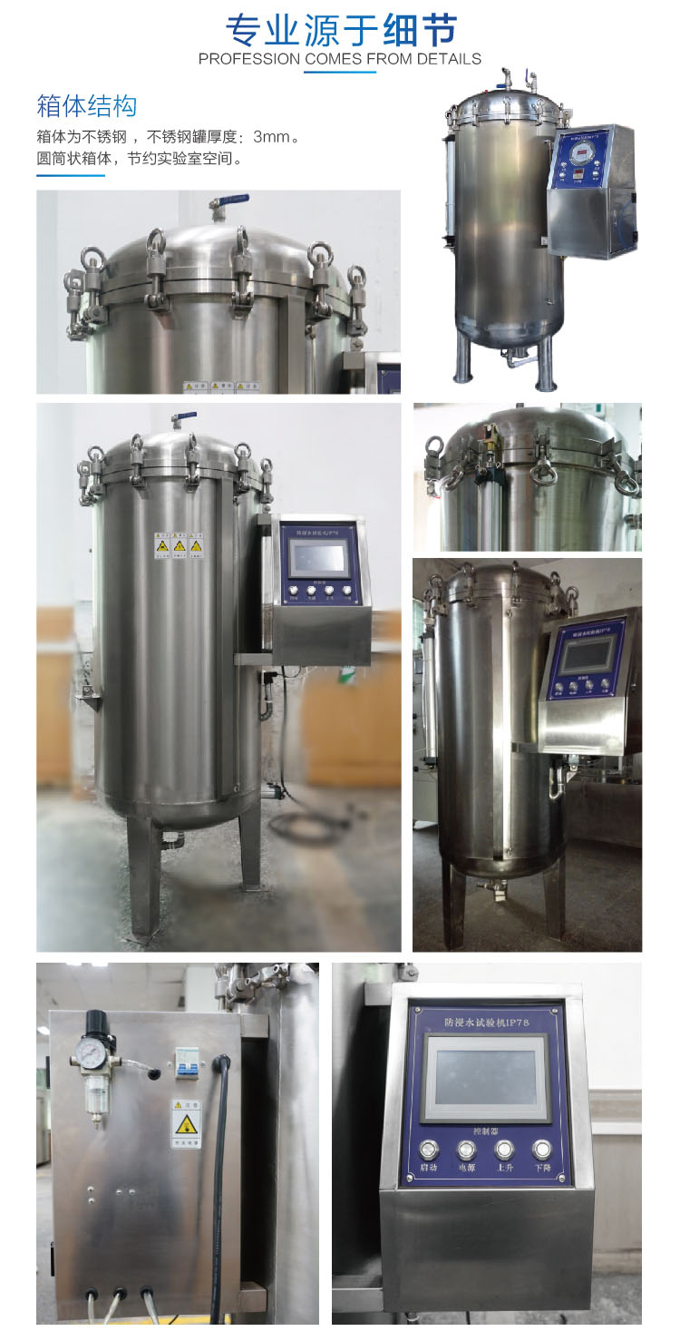型號HD-E710-4模擬水壓50m20m內箱尺寸(W*D*H)直徑600*高1000mm直徑400*高600mm外箱尺寸(W*D*H)直徑820*高1500mm直徑600*高1100mm箱體材質304不銹鋼,厚度3mm水壓常壓-0.5MPa常壓-0.2MPa測試周期0 ~ 99分, 99秒試樣提升裝置手提式不銹鋼吊籃水位顯示刻度加水位管不銹鋼罐厚度6mm3mm控制器PLC觸摸屏控制器保護裝置帶壓力保護防暴裝置和排水卸壓裝置電源三相,AC380V, 50/60HZ | ||