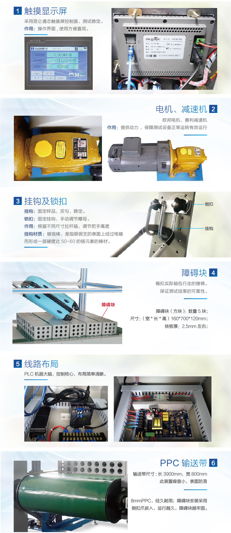 1.控制方式:彩色觸摸屏(方便實(shí)用),人機(jī)界面操作方式 2.測(cè)試速度:0-3km/h (可調(diào)) 3.試驗(yàn)次數(shù):0-9999次 4.階梯高度:高15cm 三塊 5.階梯路面寬12*0.3cm 兩塊 6.拉桿測(cè)試高度調(diào)節(jié):手輪快速調(diào)節(jié) 7.輔助功能:中途試件掉落,感應(yīng)到會(huì)自動(dòng)停機(jī) 8.電源:AC220V 50HZ | ||