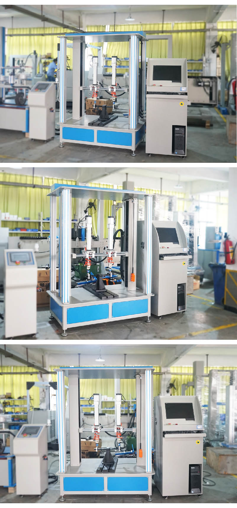 滑板車車把動態(tài)疲勞試驗機HD-J247A-S模擬自行車在實際騎行過程中,在不同的路況下,車把組件會受到人手給予的不同方向的力,尤其是在較顛簸路面上騎行時,受到的力就比較大和頻繁,因此車把組件的質(zhì)量好壞關系到整個車子的使用安全性和使用方便快捷性。本試驗機是根據(jù)EN14764、EN14766和EN14781相關疲勞試驗相關標準設計,整個試驗系統(tǒng)通過計算機自動控制,力量的施加系統(tǒng)采用力閉環(huán)控制,當施加在車把上的試驗力達到設定的力量時自動返回換向。 設計標準:滿足ISO 4210-5-2014 (ISO標準) 4.9 一和二階段加載方式 試驗方法:試驗時將車把組件按照標準規(guī)定的方法固定在試驗機上,加載橫梁的高低位置可以通過手動調(diào)節(jié)來適應車把立管的大?。粚④嚢蚜⒐埽ɑ蚣偈景蚜⒐埽┕潭ㄔ趯S脢A具上,調(diào)整加載氣缸的上下、左右位置,使加載夾具可以剛好裝配在把橫管上,固定好各個部分。在計算機上設定好試驗要求的試驗力值、次數(shù)。調(diào)整好允許車把的Z大變形量,超過此變形量后機臺會自動停止測試;啟動試驗程序開始測試,試驗達到設定次數(shù)或試件損壞,機臺自動停止測試并保留試驗結(jié)果。 |
