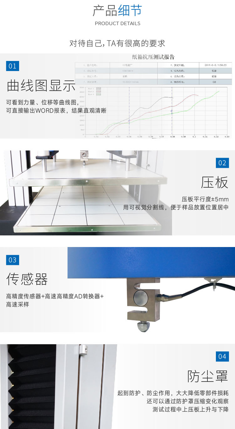 電腦式紙箱抗壓機(jī)是檢驗(yàn)紙箱或其它包裝容器耐壓強(qiáng)度較直接的測(cè)試儀器,用于判定紙箱的抗壓能力,并可做持壓堆碼的測(cè)試;電腦式紙箱抗壓機(jī)試驗(yàn)的結(jié)果可作為工廠堆放成品包裝箱高度的重要參考或是設(shè)計(jì)包裝箱的重要依據(jù)。電腦式紙箱抗壓試驗(yàn)機(jī)可執(zhí)行GB、ISO、ASTM、BS、DIN、JIS等標(biāo)準(zhǔn)進(jìn)行試驗(yàn),為各工廠企業(yè)、技術(shù)監(jiān)督部門、商檢機(jī)構(gòu)、科研院所及大 專院校等部門理想的檢測(cè)與研究設(shè)備。 設(shè)計(jì)標(biāo)準(zhǔn): GB/T6543《運(yùn)輸包裝用單瓦楞紙箱和雙瓦楞紙箱》 GB/T4857.4《運(yùn)輸包裝件基本壓力試驗(yàn)方法》 ISO2872《包裝運(yùn)輸件壓力試驗(yàn)》 ISO2874《包裝運(yùn)輸件用壓力試驗(yàn)機(jī)進(jìn)行的堆碼試驗(yàn)》 TAPPI-T804,JIS-20212,GB4857.3.4, ASTM-D642, QB/T1048, BS EN ISO 12048, GB/T4857.16, GB/T8167, GB/T8168, GB/T4857.3,GB/T4857.4 | ||